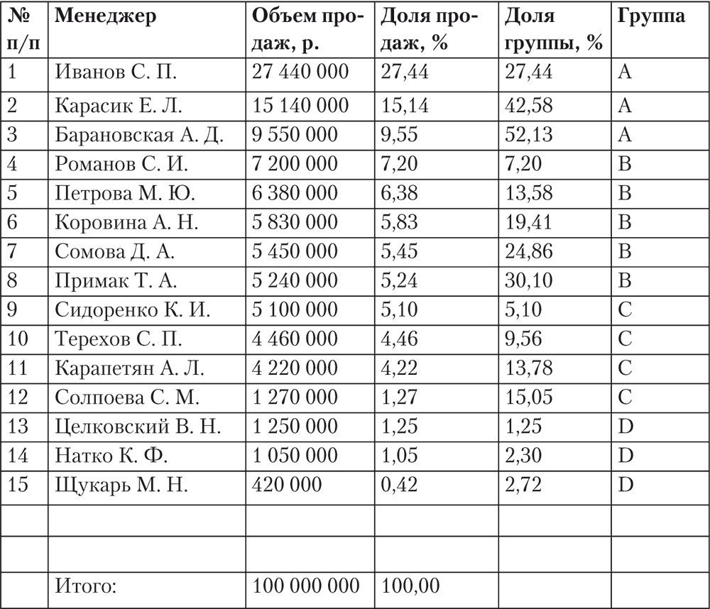 Таблица 33.1. Анализ объемов продаж по менеджерам отдела продаж