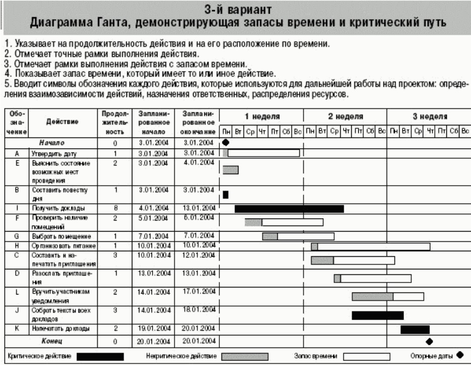 Все современные системы управления проектами и планирования предлагают представление графиков работ в виде диаграмм Гантта. В то же время диаграммы Гантта имеют ряд очевидных недостатков. Например, с помощью диаграмм Гантта неудобно планировать многовариантные взаимосвязанные цепочки работ (в строительных, военных, государственных проектах, производстве). Для таких задач в военном ведомстве США в 50-е годы были предложены методы сетевого планирования, или методы выбора «критического пути». Кроме того, диаграммы Гантта удобно применять только для одного критического ресурса – времени. При необходимости учета еще нескольких ресурсов, например, технологической оснастки – диаграммы Гантта надо воспринимать как «объемные», приобретающие ряд измерений по числу учитываемых ресурсов. Это удобно для визуальной интерпретации планов, но затрудняет их анализ.