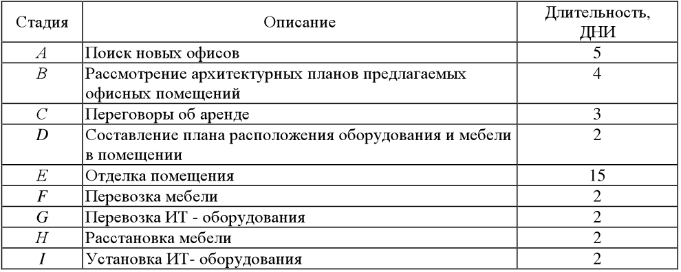 Первый вопрос, возникающий при беглом взгляде на постановку задачи и таблицу с описанием работ предполагаемого проекта: сколько времени потребуется для выполнения работ всего проекта? Простое суммирование планируемого срока исполнения, дает сильно завышенную длительность проекта (37 дней). Поскольку разные стадии требуют использования различных трудовых ресурсов, понятно, что некоторые из них могут выполняться независимо друг от друга и параллельно. Вместе с тем некоторые стадии не могут быть начаты до того, как завершены, будут другие стадии.