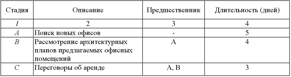 Допустим, что менеджер проекта, основываясь на знании современных строительных технологий и на здравом смысле, установил такие соотношения «предшественник– последователь» для стадий проекта.