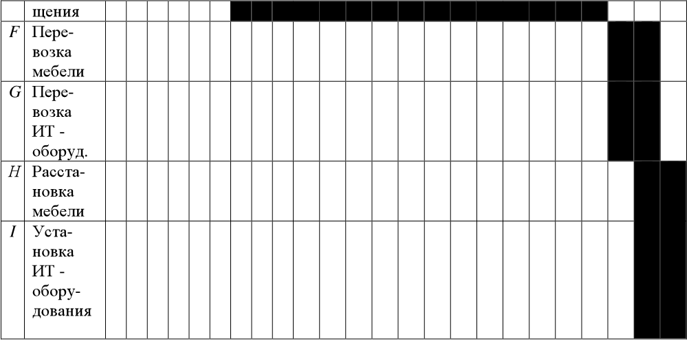 Для построения диаграммы необходимо отобразить стадии прямоугольниками, длины которых пропорциональны длительности стадий (Ошибка! Источник ссылки не найден.4). По вертикали отображаются стадии, по горизонтали дни выполнения. Отмечать прямоугольники обозначающие проведение мероприятия необходимо руководствуясь тем, что начинать каждую стадию так рано, как, только возможно. Продолжая процесс построения до исчерпания всех стадий, будет определена длительность проекта – 24 дня.