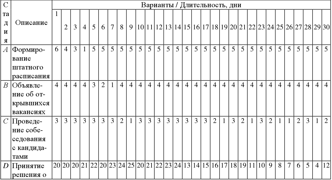 Каждое из перечисленных мероприятий рассматриваться как независимая стадия проекта (или работа), требующая собственных материальных, финансовых и людских ресурсов. Для каждой стадии длительность проведения работ оценена, исходя из имеющихся ресурсов и приведена в таблице 1.