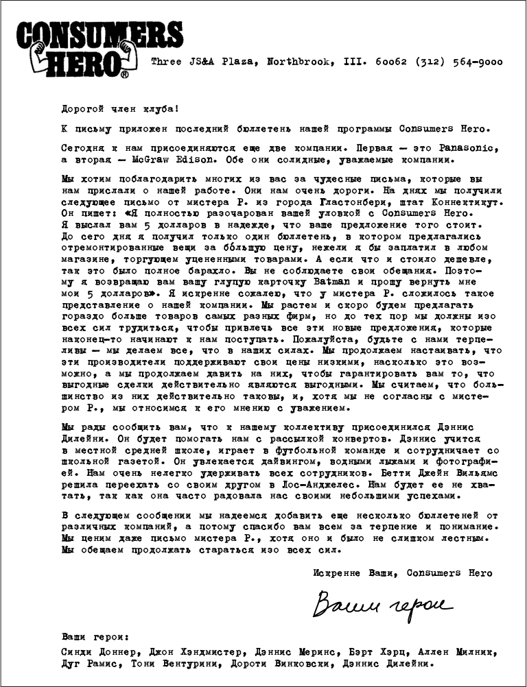 В качестве членских карт мы рассылали наши кредитные карточки Batman. (С этими карточками связана отдельная история, но ее я оставлю для другой книги, которую вскоре собираюсь написать.) Одним из качеств, которые мы пытались внушить, была абсолютная и безусловная честность. Мы были настолько честны, что читатель начинал даже беспокоиться за нас. Ниже в качестве примера приводится типичный образец такого письма (немного простоватое и очень личное письмо, разосланное членам Consumers Hero).