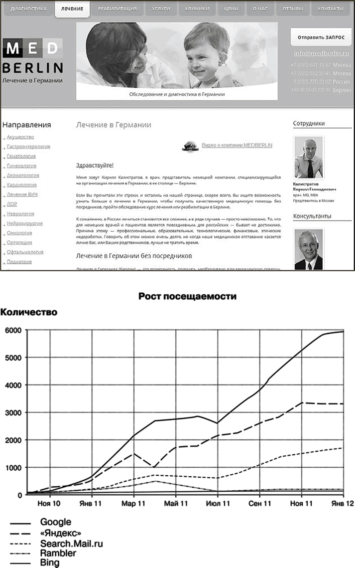 Пример 4. Сайт компании, занимающейся организацией лечения в Германии. Мы взяли его, что называется, с нуля. На рис. 1.4 вы видите, как в течение года планомерно росла посещаемость веб-страниц из разных поисковых систем: на сайт приходят представители целевой аудитории, заинтересованные в предлагаемых компанией услугах. В начале их работы звонков и обращений с сайта не было вообще. Сегодня они получают около двух десятков обращений в день, что для сайта подобной тематики хороший результат.
