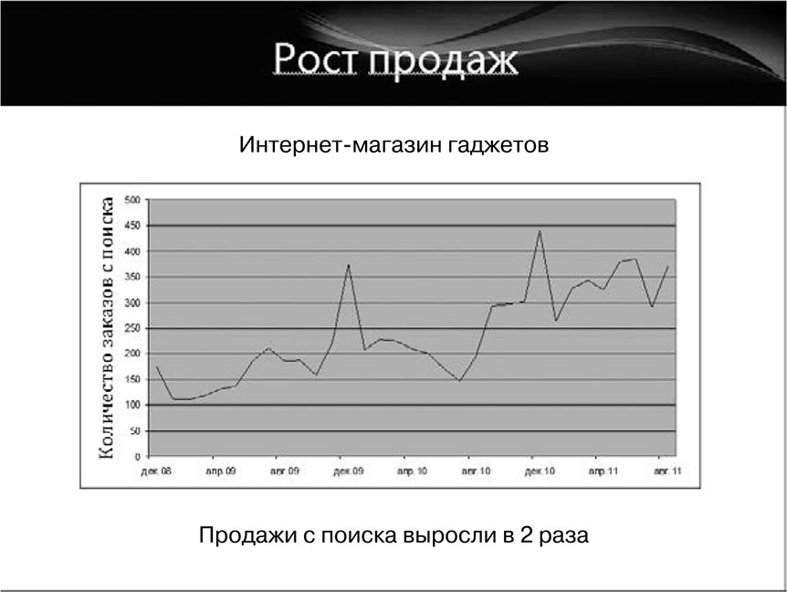 Пример 6. Интернет-магазин гаджетов с узким ассортиментом продукции (300–400 наименований специфических товаров – наушники, кабели, чехлы и пр.). На рис. 1.6 приведен график, отображающий результаты за два года работы: в этот период продажи увеличились в два раза. Это не предел: денег интернет-магазин мог бы заработать и больше, если бы расширил ассортимент. Чем интереснее предложение, тем выше продажи.