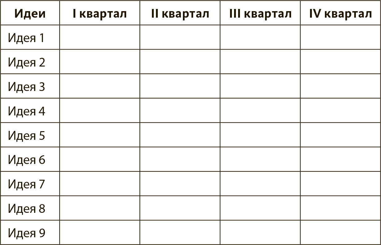 1) полоса бумаги длиной примерно 3,5–4 метра и шириной в метр. На ней (назовем ее для простоты листом) участники строят таблицу: в крайнем левом столбце сверху вниз фиксируются уже проработанные лучшие идеи в порядке убывания их приоритета, а столбцы справа означают определенные временные интервалы (в данном случае квартальные периоды). Табличный лист прикрепляется на стену с помощью обычного малярного скотча;