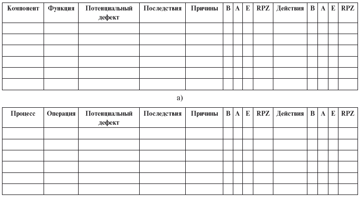 Рис. 5.15. Таблица для проведения FMEA конструкции (а) и процесса (б)