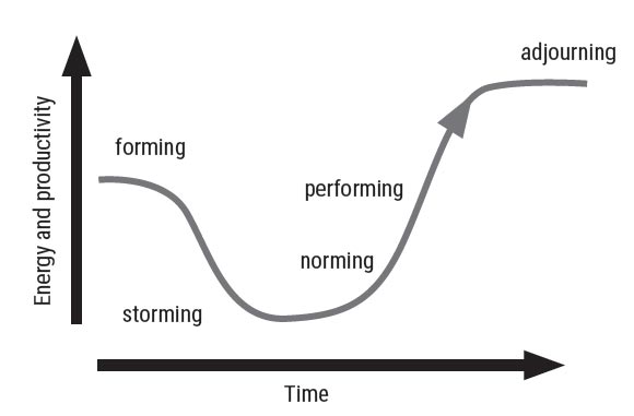 Очень часто после формирования команды (forming) и неизбежного спада в отношениях (storming) и результативности работы, связанного с согласованием ролей, целей, взаимовыгодных условий и комфортного сосуществования в проекте, наступает период самой высокой производительности и эффективности. Многие учебники по бизнесу завершают кривую жизненного цикла команды именно на этой стадии, забывая о том, что в модели есть еще стадия adjourning – когда люди начинают расходиться, потому что их совместная работа становится менее результативной.