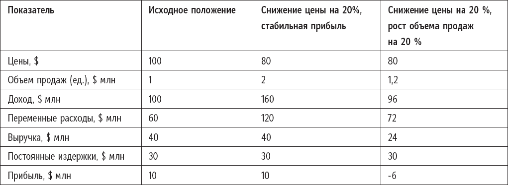 Даже если ваш торговый персонал сумеет продать на 20 % больше товара после снижения цен, вы все равно останетесь в убытке. Выручки с продаж недостаточно для покрытия постоянных расходов. Когда цена снижается со $100 до $80, выручка сокращается вдвое, потому что каждый станок все равно обходится вам в $60. Правда в том, что после снижения цен вам придется удвоить объем продаж, чтобы удержать прибыль на уровне $10 млн. Все, что меньше этой цифры, сократит вашу прибыль.