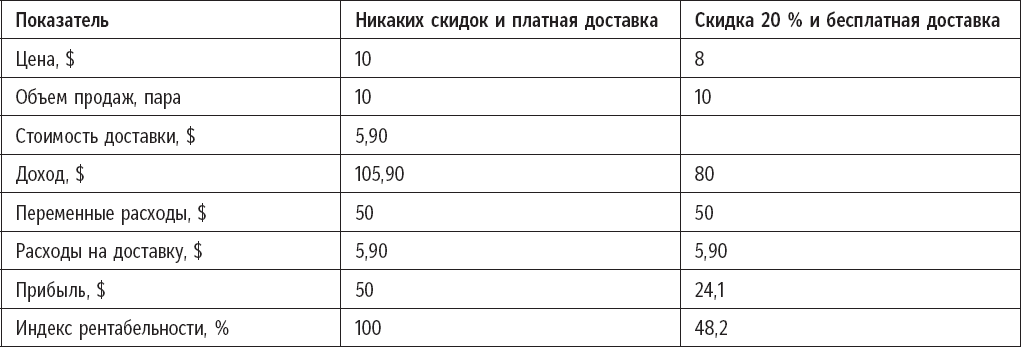 Приведем в качестве примера компанию, которая продает носки онлайн. Если вы закажете 10 пар, то получите скидку 20 %. Когда я спросил одного из их топ-менеджеров, насколько это разумно, он ответил, что если взять в качестве точки отсчета носки за 100 % от оптовой цены, то он вполне может позволить себе такую скидку. В качестве дополнительного «пряника» он предоставлял бесплатную доставку (то есть минус еще $5,90), если заказ стоил больше $75.