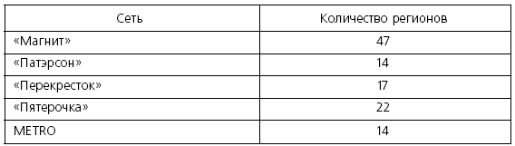В 2005 и 2006 гг. лидеры ритейла демонстрировали высокие темпы региональной экспансии в города: «Магнит» (47 филиалов, 313 городов), «Пятерочка» (22), «Перекресток» (17), «Патэрсон» (14). Также заметные шаги в регионы сделали METRO, «Рамстор», «МОСМАРТ», Spar (табл. 6.6).