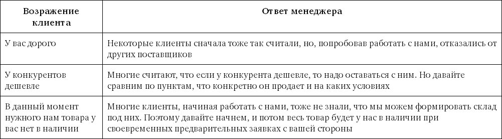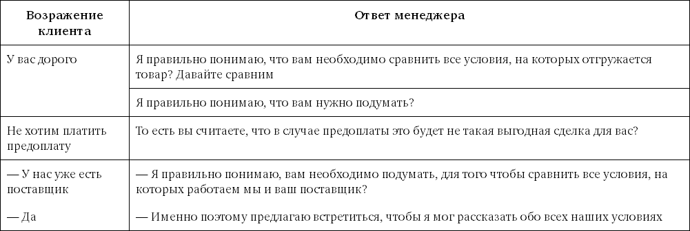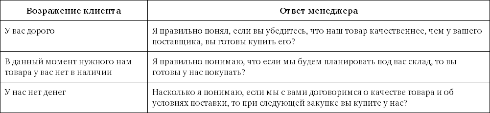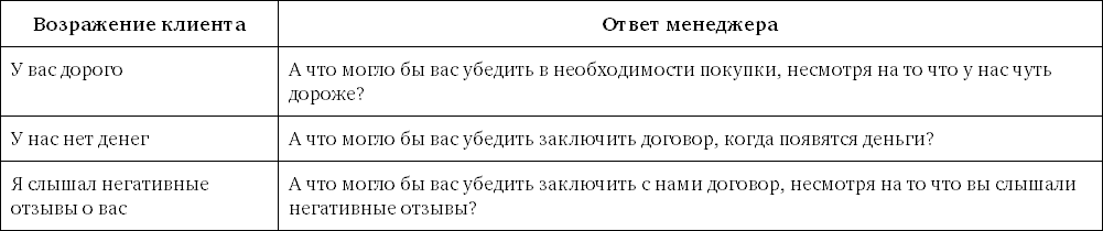 Если же вы совсем не знаете, как ответить на возражение клиента, или клиент поставил вас в тупик постоянным упоминанием одного и того же возражения, спросите: «А что могло бы вас убедить, несмотря на это возражение?». Может оказаться, что это возражение ложное и за ним стоит совсем другое возражение, с которым и нужно работать.