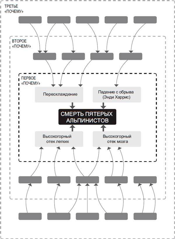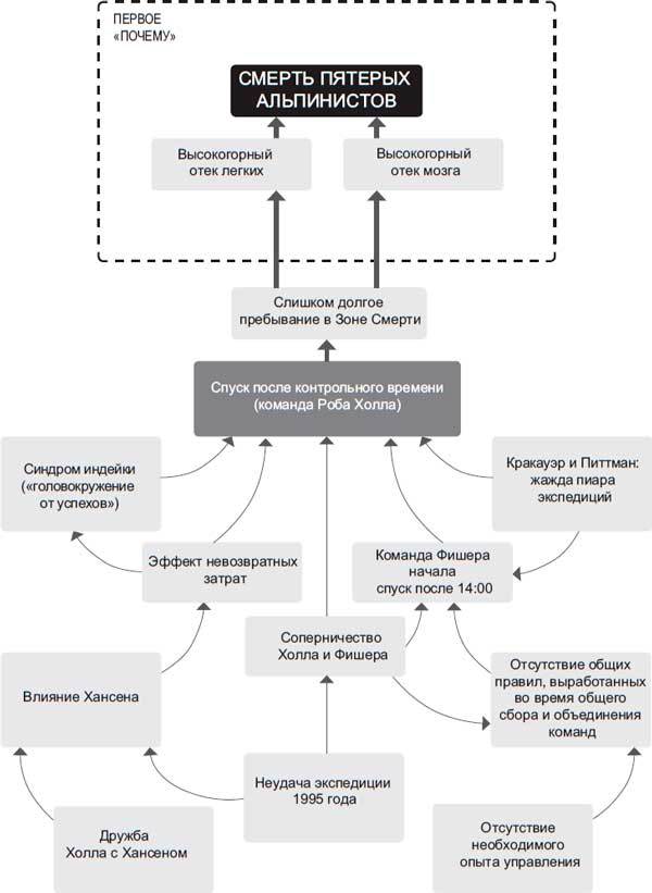 На следующей странице вы увидите график причинно-следственных связей, наглядно демонстрирующий главные причины развернувшейся на склонах Эвереста трагедии[73].