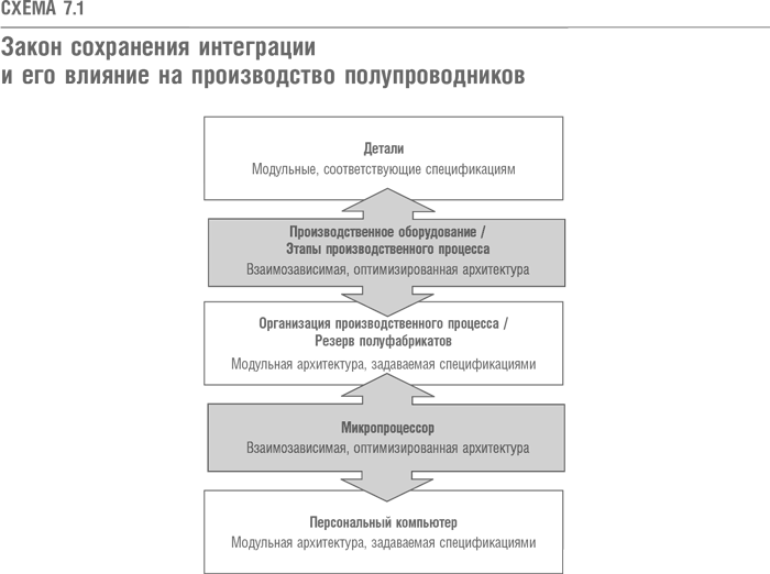 Теория РПЦ и связанный с ней закон сохранения интеграции объясняют, как должна выглядеть цепочка создания стоимости в производстве полупроводниковых схем. Если помните, закон сохранения интеграции утверждает, что тем участкам цепочки, которые нуждаются в оптимизации и поэтому должны иметь взаимозависимую архитектуру, следует находиться в окружении участков конфигурируемой архитектуры. Как показано на схеме 7.1, архитектура аппаратов, обеспечивающих обработку пластин на каждом этапе производственного процесса, должна быть патентованной и взаимозависимой: только так можно добиться минимальной ширины дорожек. Для того чтобы поддержать подобную оптимизацию, инвентарные резервы, где хранятся полуфабрикаты, должны быть модульными контактными зонами, которые соединяют этапы производственного процесса. Иными словами, оптимизированными должны быть сами этапы производственного процесса. Но при этом промежуточные зоны между этими этапами должны иметь модульную структуру. В результате такого модульного производственного процесса появляется процессор, который сам обладает взаимозависимой, оптимизированной архитектурой. Конечные продукты, например, компьютер, обладают модульной архитектурой и представляют собой различные конфигурации на базе оптимизированного микропроцессора с взаимозависимой архитектурой. Интеграция сохраняется на каждом этапе всего процесса, но при этом переход от одного этапа к другому осуществляется через модульные контактные зоны.
