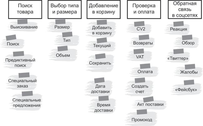 Как только определен или составлен рабочий процесс, соберите вместе все идеи насчет того, что необходимо будет сделать на каждом шаге этого пути. Подобная группировка этих элементов обеспечивает описание функциональности шага и может называться функциональными группами. Какие-то детали будут совершенно необходимы, а другие можно отнести к категории приятных дополнений. Их стоит упорядочить с самого начала.