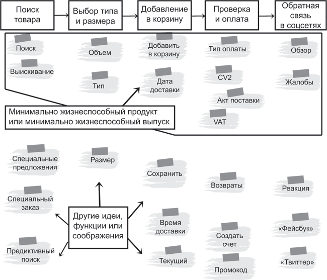 Как только вышесказанное будет сделано, обдумайте каждый важный шаг в движении к заказчику от первого дня до реализации и что является самой ценной частью идеи в рамках этих шагов. Такой выбор может быть сложным и в конце концов зависеть от мнения, но мнение заказчика – или того, кто представляет собой его бизнес, – имеет решающую роль. Конечный результат шагов – тот приемлемый минимум для заказчика, которого проект должен достичь в этом шаге. Это обычно называется минимально жизнеспособным продуктом (minimum viable product, MVP) или минимально жизнеспособным выпуском (minimum viable release, MVR).