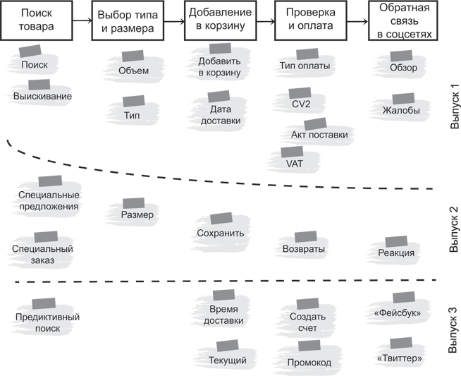 Как только определено, что будет в минимально жизнеспособном продукте (MVP) или минимально жизнеспособном выпуске (MVR), начинается настоящее веселье. Дополнительный функционал или новые характеристики продукта могут добавляться по частям или быть частью большого релиза. Это называется инкрементная поставка, и бизнесмены ее очень любят. Никаких больше долгих лет ожидания одного большого выпуска со всеми «свистульками». Выпуск продукта в Agile-разработке происходит быстро и часто. И, опять же, именно заказчик определяет, что и когда выпускать. Как минимум отдельный выпуск должен содержать одну характеристику, проверенную практикой.