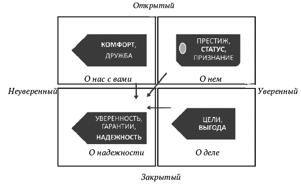 Немножко ее преобразовав, я обозвал ее «СВиНКа» по первым буквам ключевых типов – Статусники, Выгодники, Надежники, Комфортники (рис. 1.2). Система координат тоже простая: уверенный – неуверенный, открытый – закрытый.
