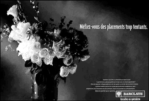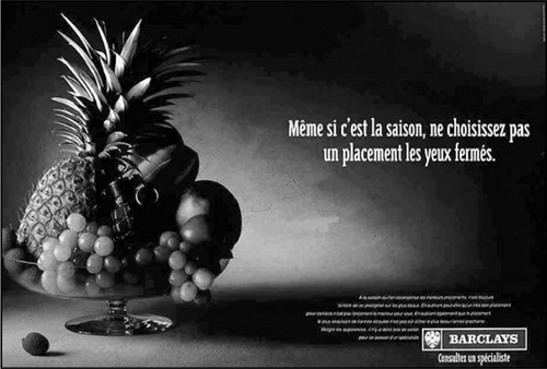 Приглядитесь к картинке внимательнее (рис. 31). В вазе с тропическими фруктами прячется совершенно несъедобная граната. «Даже если за окном жаркое лето, не стоит размещать свои активы с закрытыми глазами» – гласит заголовок. И финальный аккорд рекламы: «Проконсультируйтесь со специалистом из нашего банка».