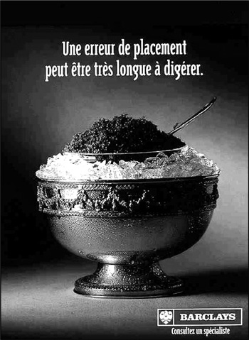 Ну и последний пример в этой серии (рис. 35). Надпись на объявлении сигналит: «Для того чтобы переварить ошибки в размещении финансовых средств, может потребоваться много времени». Свежайшая черная икра прекрасно сервирована. Идеально выдержан температурный режим. Но вот беда – аппетит портят муравьи, которые проложили свой путь прямо по деликатесному продукту.