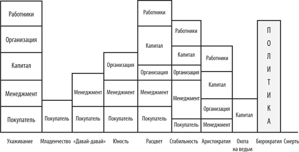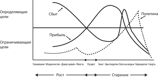 Когда компания становится совсем старой, она вступает в период, который я обозначил как Охота на ведьм. На этом этапе начинается поиск виноватых и вновь происходит смена целей. Теперь каждый концентрирует усилия на личном выживании, а не на выживании организации. Людей больше не интересуют дивиденды, доходность инвестиций или сбыт. Они беспокоятся о том, кто сумеет остаться, а кто будет уволен. Они начинают напоминать старых, дряхлых мужчин, которые больше не хотят нести никаких обязательств даже перед своими женами. Они заботятся только о своем здоровье и душевном комфорте. В стареющих организациях основные силы менеджеров уходят на политические игры.