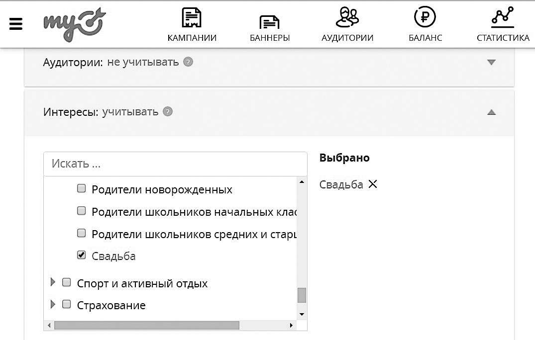 Эта настройка похожа на работу с РСЯ (читайте о ней в следующем разделе). Вы точно так же определяете интересы вашей целевой аудитории, думаете, как она будет проявлять их в поиске, и собираете ключевые слова. Точно так же отбираете средне– и высокочастотные фразы, иначе охват будет очень маленьким и реклама не будет показываться.