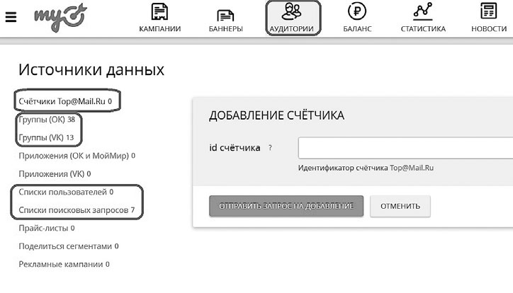 Немного сложнее с аудиториями. Их нам надо собрать заранее. В MyTarget для этого есть отдельная вкладка, которая так и называется – «Аудитории». Прежде чем отобрать их непосредственно в самом объявлении, аудитории необходимо сформировать.