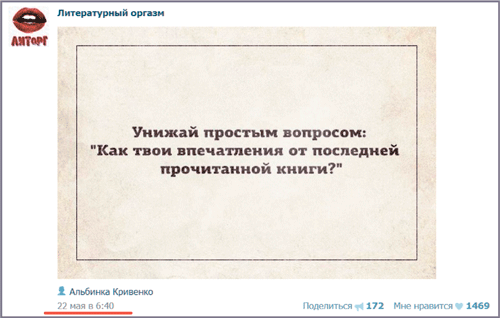 Наиболее часто встречающийся вид рекламы. Если вы активный пользователь «ВКонтакте», вы наверняка не раз видели подобные публикации. Суть их проста – людям демонстрируется какая-либо интересная информация, но главная ее часть не раскрывается до конца. Например, это может быть история, в которой повествование обрывается на самом интересном месте. Чтобы дочитать, человек должен перейти в другой паблик (обычно, кликнув на ссылку «Читать продолжение» или «Продолжение читайте в источнике»). Расчет идет на то, что если уж вы потратили время и дочитали до кульминации, вам будет жалко бросить пост, не узнав, чем все закончилось. Также в подобном виде рекламы встречаются публикации, дающие не столько интересную, сколько полезную информацию. К примеру, публикуется список стран, въехать в которые россиянин может без визы. После второй или третьей строчки опять-таки идет приглашение продолжить чтение уже в рекламируемом сообществе. Иногда, правда, админы (или их сотрудники, занимающиеся ВП – взаимопиаром), пытаясь привлечь внимание пользователей, доходят до откровенного абсурда. Так, я встречал «замануху», которая предлагала узнать, что будет, если человеку внутривенно вколоть… сперму. Уж не знаю, сколько «неофитов» принес группе такой промоход, но, полагаю, что далеко не каждому захотелось получить такую информацию.