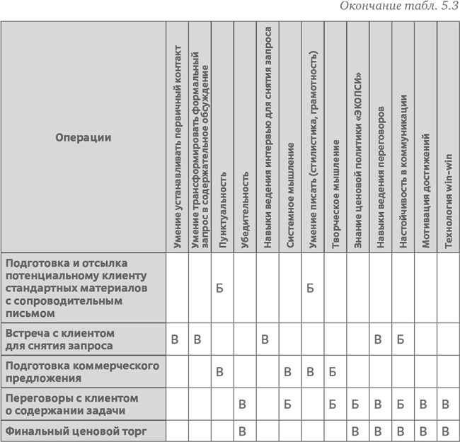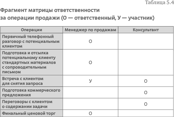 Шаг 4. Профилируем каждую должность по операциям, т. е. строим матрицу ответственности, которую мы уже обсуждали в главе 2 (табл. 5.4). В данном случае я рассматриваю только две роли: О – ответственный – отвечает за финальный результат; У – участвует, помогает.