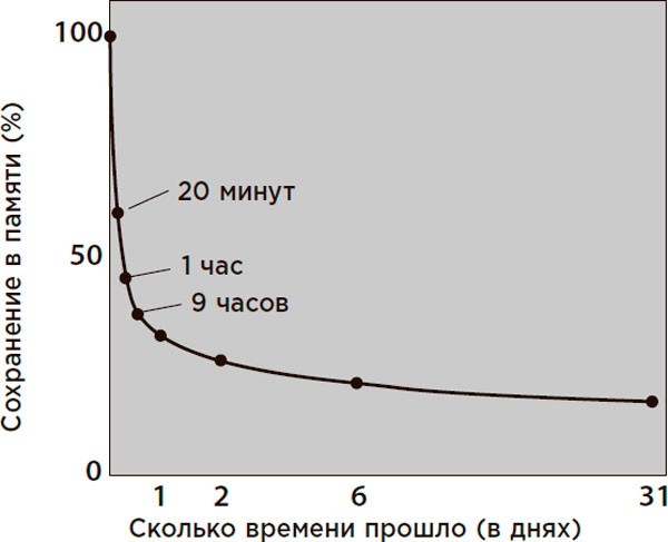 На кривой забывания Эббингауза четко видно, что уже в течение первых нескольких часов становится трудно быстро вспомнить информацию, поступившую в мозг. Повторение полученных сведений в тот же день – один из главных секретов их усвоения.
