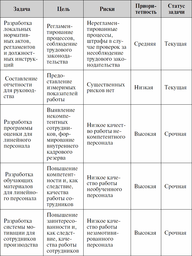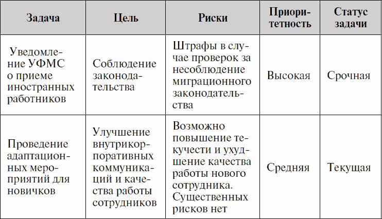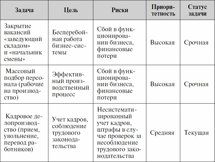 Для того чтобы правильно расставить приоритеты, необходимо установить цели, на достижение которых направлены задачи сотрудника. Чем больше цели влияют на результат бизнеса, тем приоритетнее становится та или иная задача. Кроме постановки целей важно оценить риски, которые грозят организации в случае невыполнения той или иной задачи. Именно эти два фактора являются определяющими при расстановке приоритетов. В таблице ниже представлены описанные задачи, цели, риски и, как следствие, приоритетность поставленных задач.