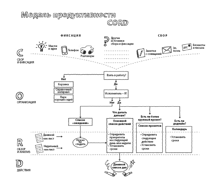 В верхней части схемы отражен этап сбора и фиксации информации, о котором мы с вами уже говорили. Сейчас мы находимся на этапе организации. О каждой новой информации, поступающей в нашу систему, мы должны задать себе ряд вопросов. В начале вам удобнее будет держать эту диаграмму где-нибудь на рабочем столе и обращаться к ней в процессе организации. Если вы предпочитаете формат PDF, то диаграмму можно загрузить с сайта http://www.thinkproductive.co.uk/productivity-ninja-resources/.
