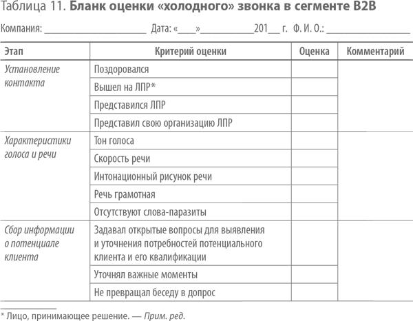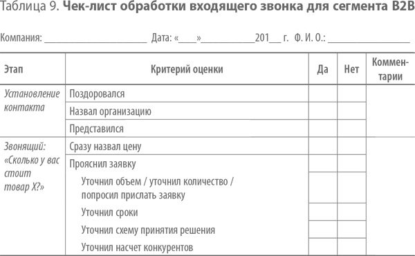После того как вы закончите создавать скрипты продаж, выделите в них самые важные пункты и внесите их в чек-листы. В качестве основы можете взять мои наработки, которые я привожу ниже (табл. 9–13).