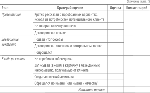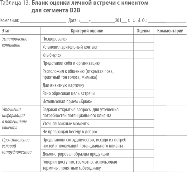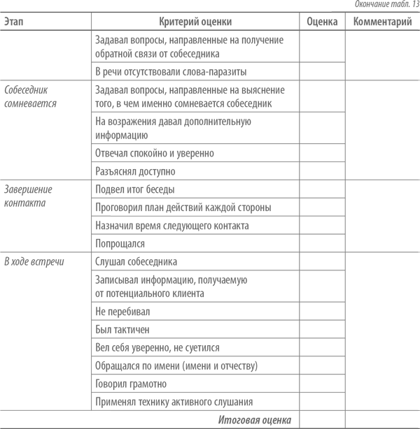 Полностью вписывайте в чек-лист речевые модули, если требуете дословного их проговаривания; если же достаточно соблюдать принцип того или иного приема – вписывайте только его название. Например, можно внести в чек-лист «Изоляция возражения» вместо дословной цитаты «То есть нам нужно обсудить только цены, а все остальные условия сотрудничества вас устраивают?».