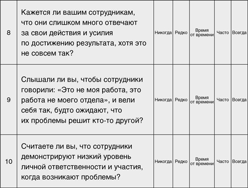 Оцените ответы по каждому пункту следующим образом: все время – 5, часто – 4, время от времени – 3, редко – 2, никогда – 1. Затем сложите баллы. С помощью приведенной ниже таблицы оцените уровень ответственности в вашей организации.