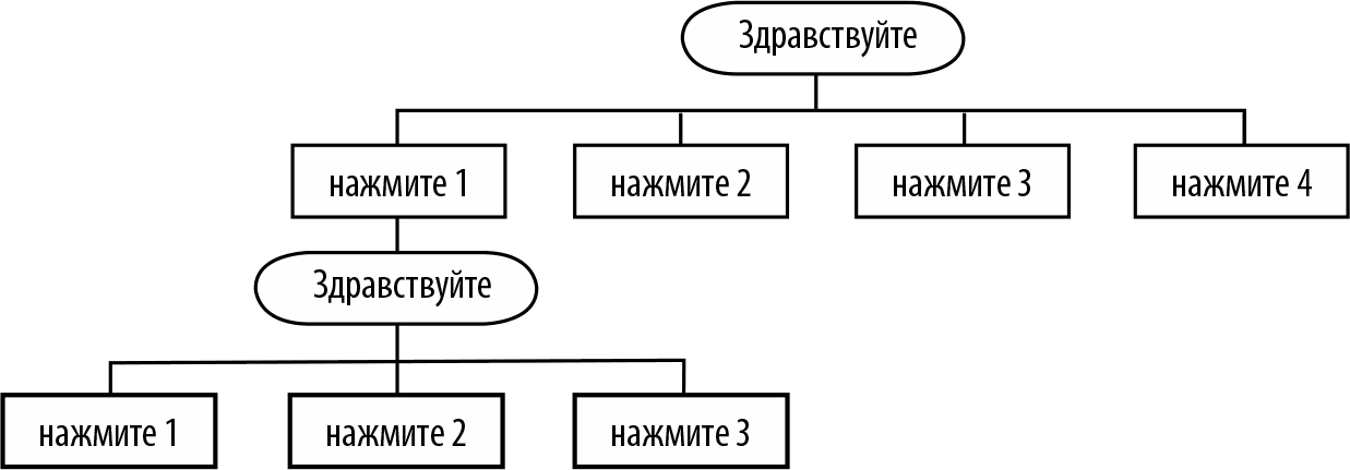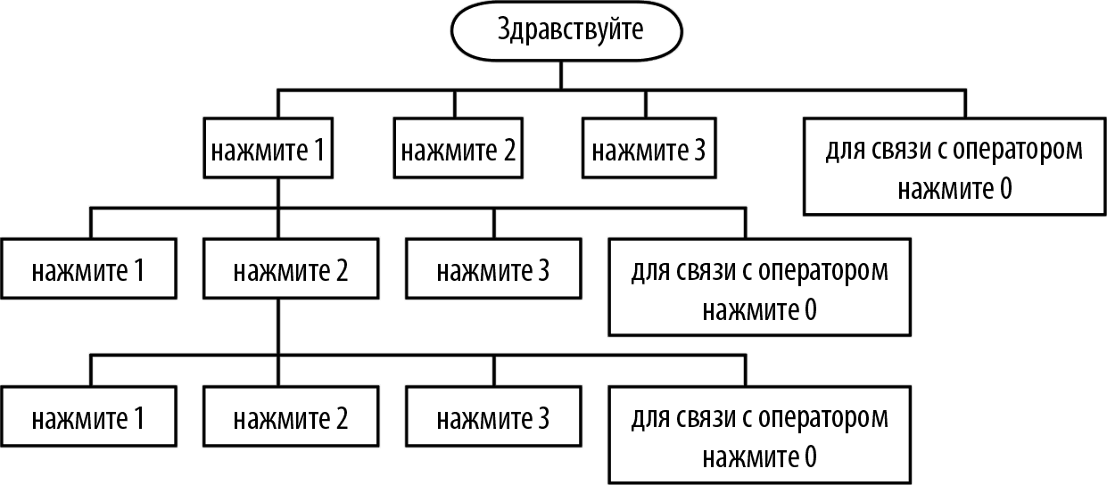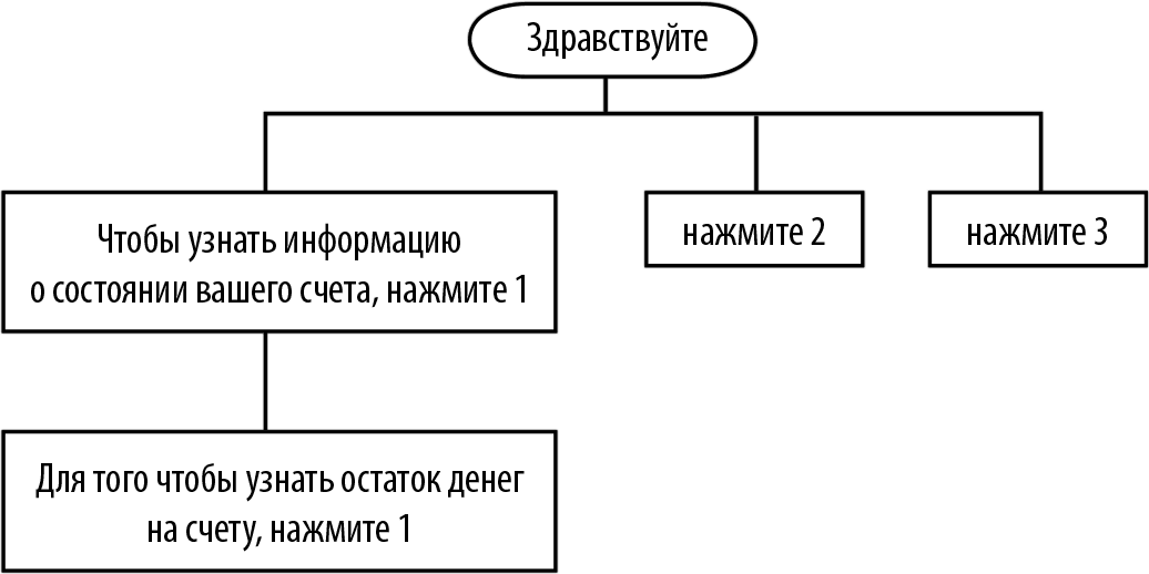 • включение повторного приветствия в ветви второго уровня (рис. 7.7). Выглядит это так: сначала произносится входное приветствие, например: «Здравствуйте, вы позвонили в банк “Пупкин и сыновья”». Затем следует предложение меню, например: «Для входа в меню банковских услуг нажмите 1, для справочной информации нажмите 2 и т. п.». И когда абонент нажимает цифру 1 (или 2, или 3 и т. п.), он снова слышит: «Здравствуйте». Вежливость, конечно, дело хорошее, но надо ведь и меру знать;