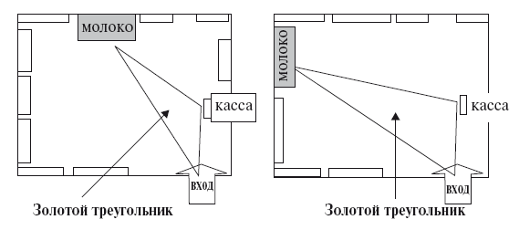 • закон «золотого треугольника»: зоны, расположенные между входной дверью, кассой и самым ходовым товаром (эффект заимствования популярности). Чем больше площадь треугольника, тем выше объем продаж (рис. 5.8);