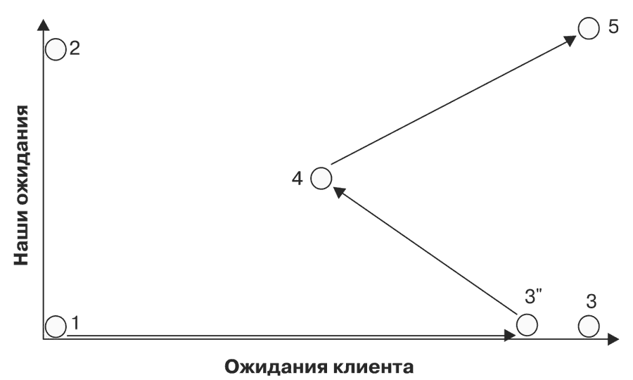 В этой плоскости нередко начинают с хода 1 —> 2. Что это значит? Насилие над клиентом. Во что бы то ни стало «втюхать», «втюрить» ему свой продукт или услугу. Удовлетворить свои ожидания, а там хоть трава не расти. Итак, назовем точку 2 «точкой насилия». Может ли клиент полюбить вас после этого? Далеко не всегда. Хотя один мой во всех смыслах мощный знакомый утверждал, что клиента можно и нужно насиловать, «стерпится – слюбится», и осознавший твою мощь клиент сам позовет тебя в точку 5, где счастливы все.