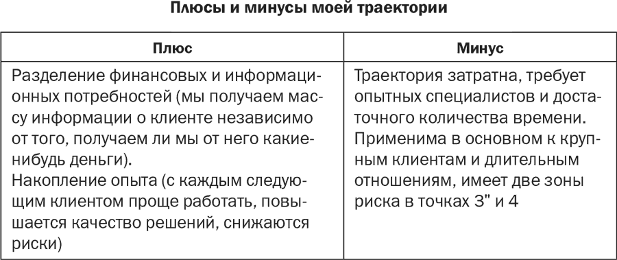 В точке 3" клиент близок, можно его подробно расспросить, попытаться понять и, в случае если общие интересы есть, под ручку с ним двинуться в точку 4 – «точку компромисса». А уже из точки 4, как следует поработав вместе, можно объединить усилия и пойти в точку 5. Путь этот не близок и не усыпан розами, риск потери клиента есть и в точке 3", и в точке 4 (клиент может удрать «из-под венца» в точку 1 или точку 3, стать конкурентом), и даже по дороге к точке 5, но каждый сам волен выбирать свой путь в этой плоскости.