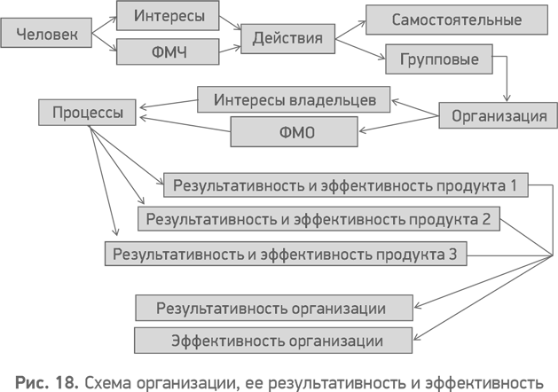 Организация выстраивает и запускает процессы в соответствии с групповыми интересами владельцев и возможностями функциональной модели. Результатом процессов являются продукты. У каждого продукта есть своя результативность и эффективность, которые вместе образуют результативность и эффективность организации.