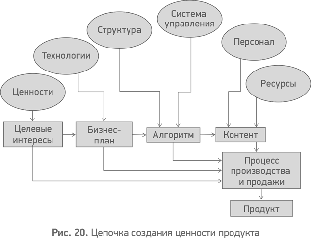 Мы уже знаем, что производство и продажа любого продукта состоит из нескольких компонентов. Как показано на рис. 20, их четыре: целевые интересы, бизнес-план, алгоритм и контент.