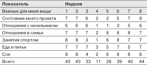 В нашем примере схема очевидна: недосыпание и недостаток физической нагрузки – первый признак надвигающегося кризиса. Первый шаг к восстановлению, помимо поддержки семьи, – снова начать высыпаться и заниматься спортом. Как только проблемы появляются на работе, они тотчас же появляются и в личной жизни, и в итоге все страдают. У каждого человека свои приоритеты и эффективные методы. Сам процесс составления таблицы спокойствия духа уже успокаивает. Он позволяет обдумать ситуацию и восстановить силы.