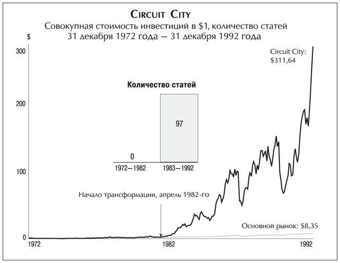 Неудивительно, что Circuit City вскоре стала объектом пристального внимания прессы. С одной стороны, о ней не было ни одной значительной публикации в течение десятилетия, предшествующего трансформации. С другой – мы обнаружили 97 заслуживающих внимания статей после трансформации компании, 21 из них были достаточно большими. Казалось, что компании и не существовало до этого момента, хотя ее акции продавались на основных фондовых биржах с 1968 года, а Вуртзел и его команда добивались серьезных успехов в течение предшествующих десяти лет до прорыва в показателях.