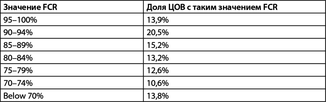 Выше я упоминала, что, по мнению многих источников, например SQM Group и Yankee Group, FCR во многих колл-центрах находится на уровне 70 %. По моим ощущениям, это слишком пессимистичная картина. Думаю, в большинстве ЦОВ показатель FCR находится на уровне 80–90 %. Это неплохо согласуется с данными опроса, проведенного ICMI в 2008 году, представленными в таблице 5.3.