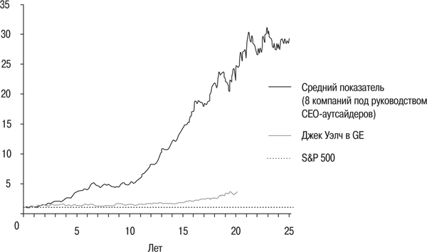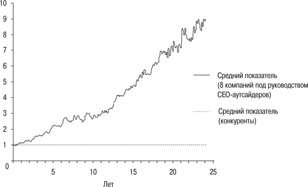 У СЕО-аутсайдеров нет ни харизмы, как у Уолтона и Келлера, ни маркетингового или технологического гения, как у Джобса или Цукерберга. На самом деле они такие же, как и любой типичный американский глава компании. Вот только получаемая ими доходность отнюдь не банальна. Как показано на рис. I.1 и I.2, в среднем они опередили индекс S&P 500 более чем в 20 раз, а своих конкурентов – более чем в семь раз. Давайте изучим способы достижения таких результатов и будем, как говорил главный в Уотергейтском скандале[12] информатор под псевдонимом Глубокая Глотка, «следовать за деньгами». Мы внимательно рассмотрим ключевые решения СЕО-аутсайдеров, принятые с целью максимизации доходности для акционеров, а также уроки, извлеченные из их стиля ведения бизнеса.