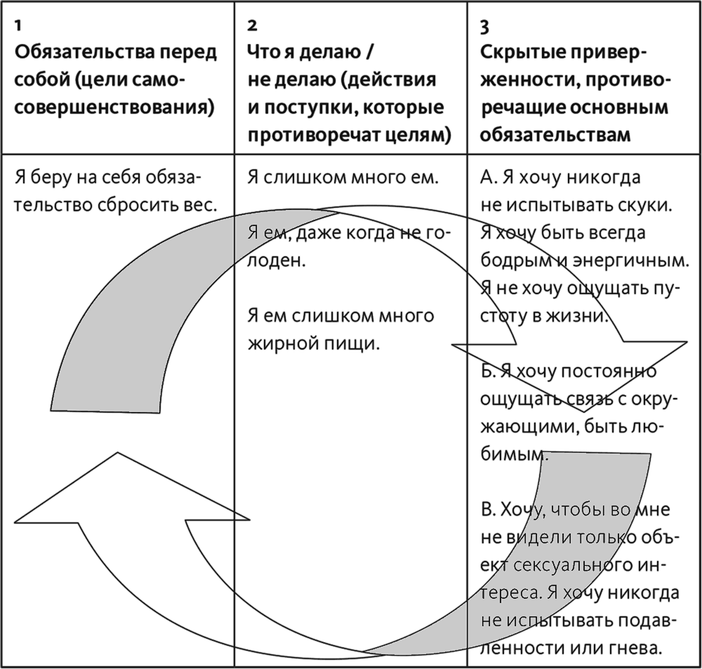 Как мы увидим позже, скрытые приверженности из колонки 3 – главные индикаторы необходимости адаптивных перемен. Важно понимать: хотя у многих людей одинаковые недостатки, подлинная их мотивация (обеспечивающая эффективность) может быть различной.
