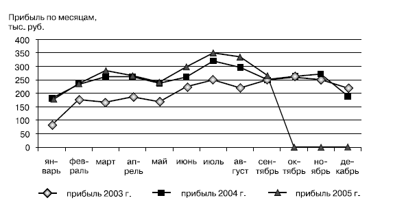 График показывает наличие ярко выраженной сезонности при продаже керамической плитке – большая часть продаж и прибыли приходится на вторую половину года и пик – на июль и август. Вызывает интерес падение прибыли в ноябре – декабре 2005 г., т. к. обычно показатели в эти месяцы по плитке лишь ненамного меньше чем летом.