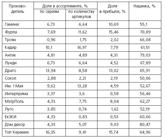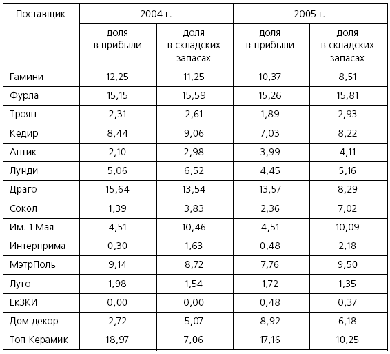 В 2003 г. донорами оборачиваемости являлись фабрики «Гамини», «Драго», «Луго», «ЕкЗКИ», «Дом декор», «Топ Керамик». Все остальные фабрики являлись акцепторами оборачиваемости. Высокая оборачиваемость «Топ Керамик» связана с коротким функциональным циклом логистики, является эксклюзивным производителем ТК «Уютный дом» и свой ассортимент продает только через сеть магазинов ТК «Уютный дом». Сокращение в ассортименте доли поставщиков с низкой оборачиваемостью в следующем году позволит увеличить оборачиваемость по направлению до уровня 2,5–3,5 с учетом товара в пути. В таблице 9.12 показана структура прибыли и товарных запасов по поставщикам по категории «керамическая плитка».