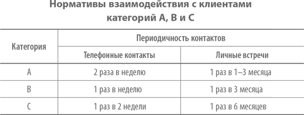 3.4.3. Выполняя установленные нормы, менеджер отдела продаж должен контактировать с каждым своим клиентом в соответствии с показателями таблицы «Нормативы взаимодействия с клиентами категорий А, В и С» (см. также табл. «Классификация клиентов на категории А, В и С» в разделе 4.2).