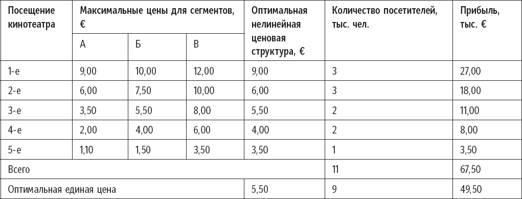 Оптимальная единая цена составляет €5,50. За эту цену сегмент А сходит в кино 2000 раз, сегмент Б – 3000 раз, а В – 4000 раз. Всего 9000 посетителей за месяц, и прибыль составит €49 500.